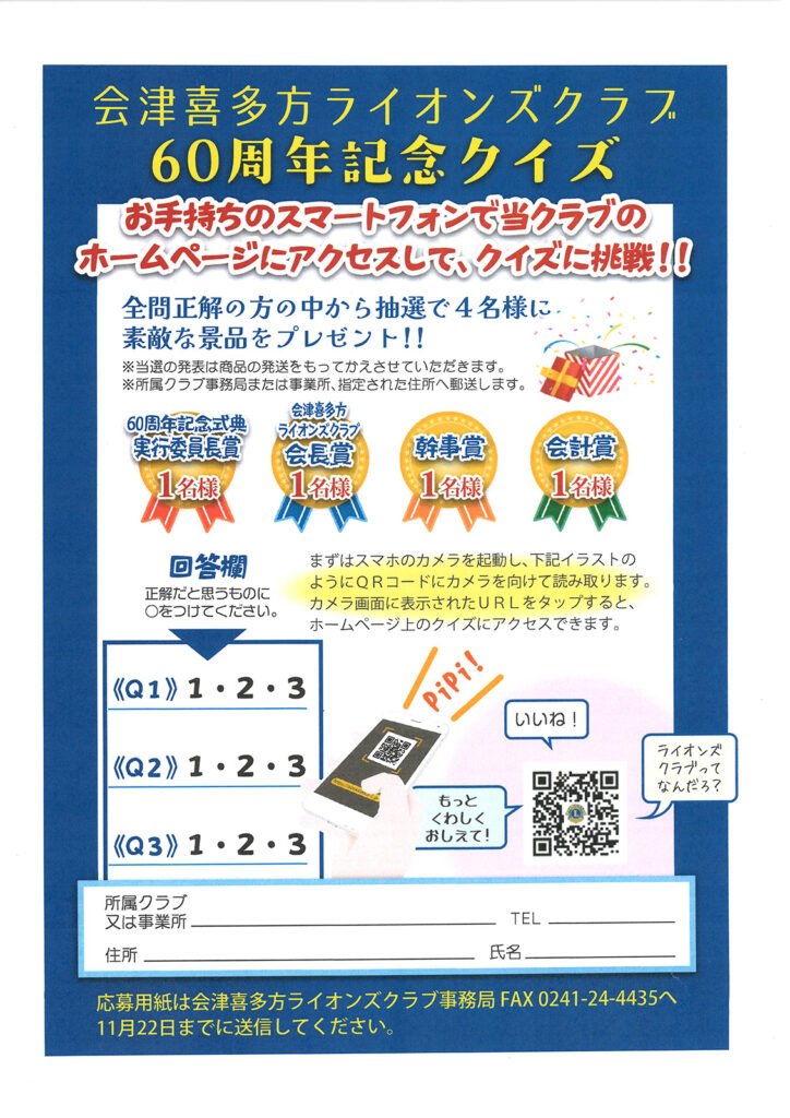 今年度の会津喜多方ライオンズクラブのスローガン「60年のレガシーの誇りと感謝。次世代のレガシーの構築に○○○○○○○」の○に当てはまるのは?