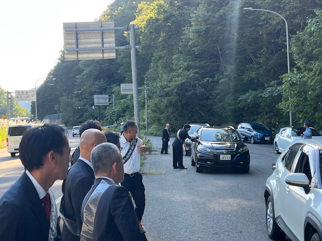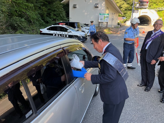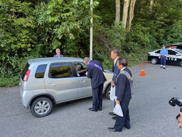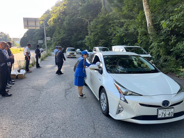 9月26日、福島県側の国道121号大峠トンネル付近で、姉妹クラブの米沢ライオンズクラブと交通安全キャンペーンを行い、ドライバーに事故防止を呼びかけました。秋の全国交通安全運動に合わせて毎年実施しています。両クラブと喜多方、米沢両警察署から25人が参加。「目的地まで安全運転をお続けください」とドライバーに声を掛け、お土産用喜多方ラーメンと啓発チラシを配りました。